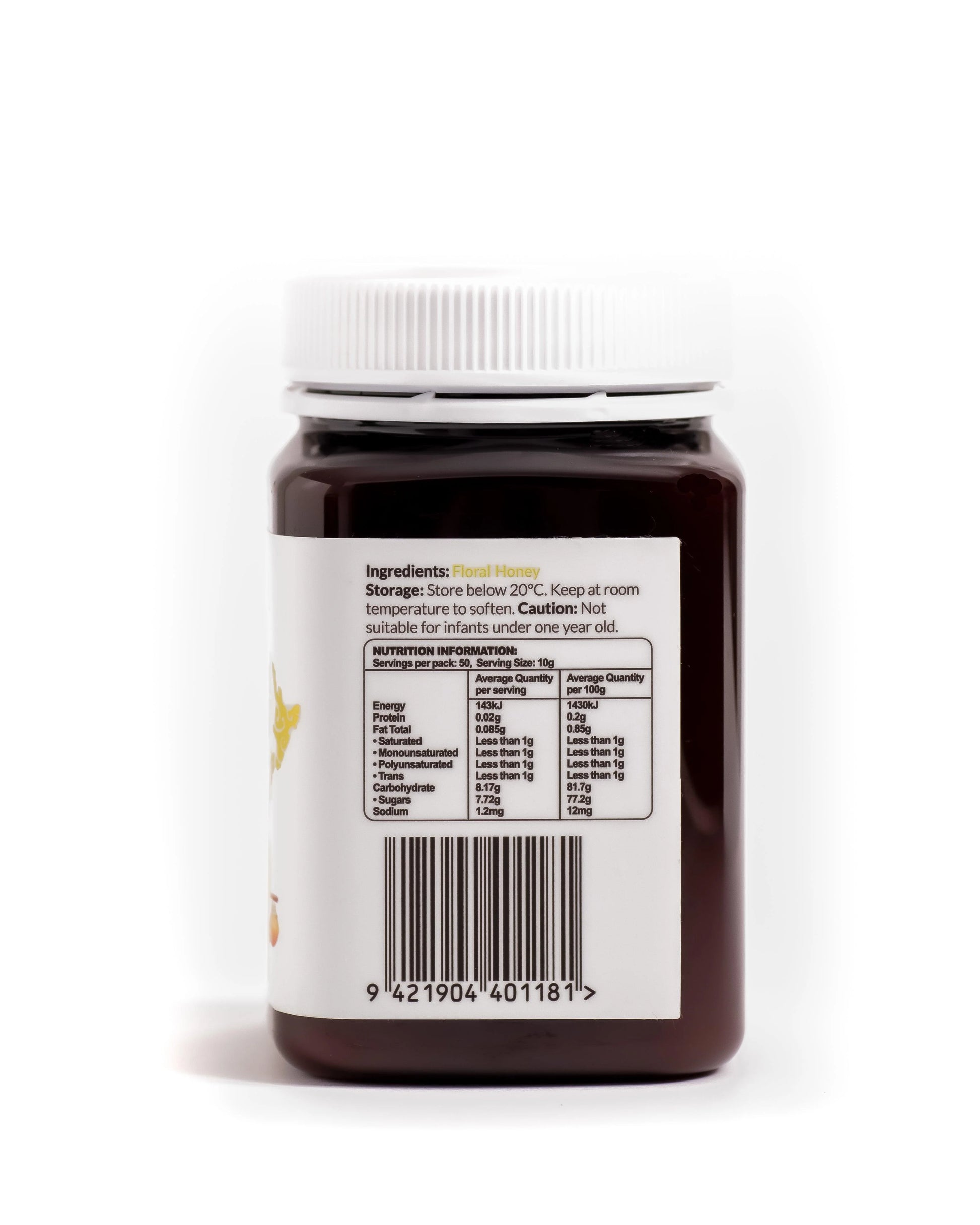 Ingredients: Multifloral Honey Storage: Store below 20° C. Keep at room temperature to soften. Caution: Not suitable for infants under one year old. Lids may come in black or white.