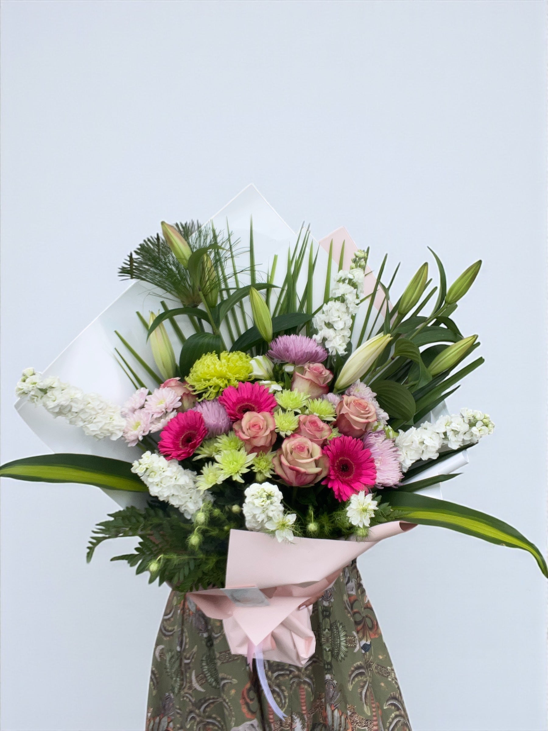 Transform any space or occasion with the gentle allure of Andra's Flowers' Bright Coloured Bouquet. Delicately sourced locally, this enchanting arrangement speaks volumes of our floristry expertise and meticulous attention to detail.